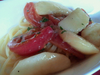 実はお昼にdさんを偲んで、小さなランチ会をいたしました。dさんオススメの桃とトマトの冷製パスタ(写真)。甘い桃と、酸味と塩味のトマト。「ね、美味しいでしょ」とdさんが言っているようでした。場所は備前町のアレッサンドロ。予約制のため、5月に参加されたかたにご案内させていただきました。