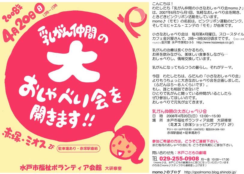 「乳がん仲間の小さなおしゃべり会momo♪」を開いています。